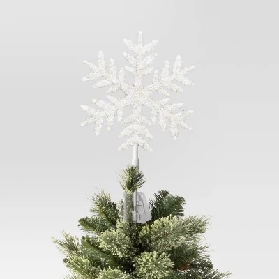 Top off your tree with the wintry glow of this 13.5-Inch Pre-lit Snowflake Christmas Tree Topper White with Warm White LED Lights from Wondershop™. Made from metal, this white snowflake tree topper is wrapped with warm white LED lights for a gorgeous glow. Plus, it easily attaches to the top of your real or artificial tree.